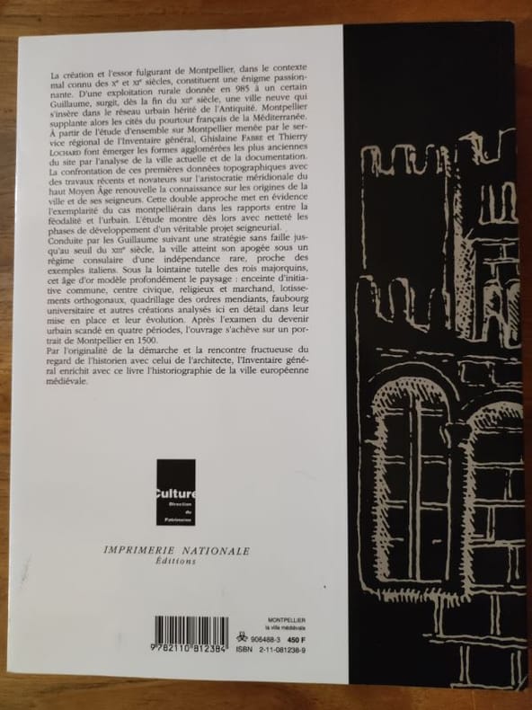 Paris Imprimerie Nationale 1992 in 4 (27x21) 1 volume broché, couverture à rabats illustrée en couleurs, 309 pages [2], avec de nombreuses photographies par Michel Descossy et Jean-Michel Périn, étui. Avec la participation de Claudie Duhamel-Amado. Préface de Jean-Marie Pérouse de Montclos. Les origines; La ville des Guillaume (1104-1204); La ville consulaire (1204-1349); La ville française (1350-1500); La ville à la fin du moyen-âge; Documentation; Index. Service Régional de l'Inventaire de Languedoc-Roussillon, Direction Régionale des Affaires Culturelles. Collection: Cahiers du patrimoine, Etude du patrimoine de Montpellier, N°3. Bel exemplaire