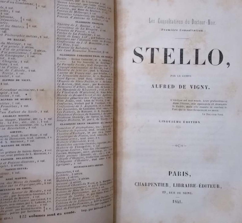 Edition en partie originale. L'ouvrage - magistral - met en scène l'histoire tragique de trois poètes, illustrant le conflit inévitable entre la création poétique et l'existence collective. ''Stello, un jeune homme à l'âme ardente, se sent une vocation de poète. Son ami le Docteur-Noir, qui redoute pour lui les déceptions de la vie, le traite comme un malade et entreprend de le guérir. Il lui conte l'histoire lamentable de Gilbert, puis celle de Chatterton, enfin celle d'André Chénier : ces trois poètes, l'un dans l'Etat monarchique français, le second dans l'Etat constitutionnel anglais, le dernier dans l'Etat révolutionnaire et démocratique ont été semblablement victimes d'un gouvernement qui a redouté leur génie. Stello est indigné par ces exemples ; et le Docteur Noir rédige une ordonnance où il prescrit de "séparer la vie poétique de la vie politique". Angles et coiffes légèrement élimés. Dos insolé. Quelques feuillets pourvus de rousseurs. Du reste, bel ensemble.