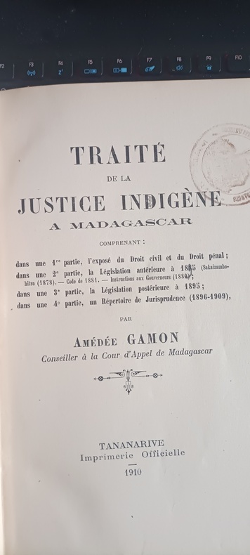 1910, Imprimerie Officielle, Tananarive, in-8 (16,5 x 25 cm), demi reliure, dos muet, plats marbrés, demi reliure, 411 pages, XII (table des matières) 1re partie : Exposé du droit civil et du droit pénal indigènes. 2e partie : Législation antérieure à 1885. 3e partie : Législation postérieure à 1895. 4e partie : Répertoire de jurisprudence (1896-1909).