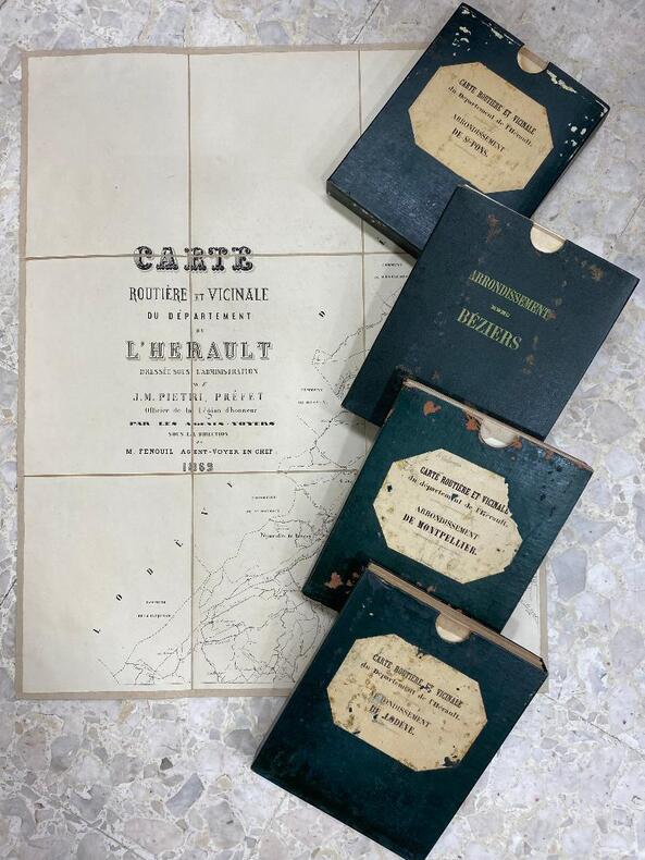 4 étuis cartonnés, sans nom, 1862-1864 de cartes entoilées et rempliées, La carte est dressée sous l'administration du préfet J.M. Pietri, sous la direction de l'agent-voyer Fenouil. Arrondissement de Montpellier: 8 cartes (1862); Arrrondissement de Lodève: 6 cartes (1862); Arrondissement de Saint-Pons: 6 cartes 1862); Arrondissement de Béziers: 9 cartes (1864). La taille des cartes est de 46,5 cm x 59 cm.