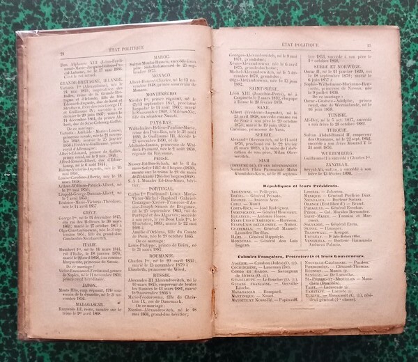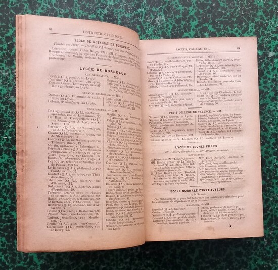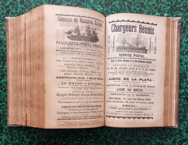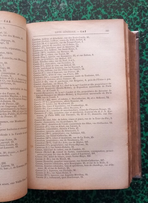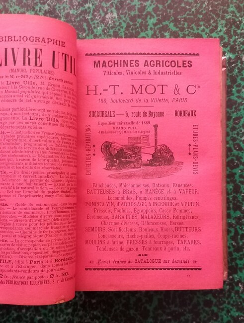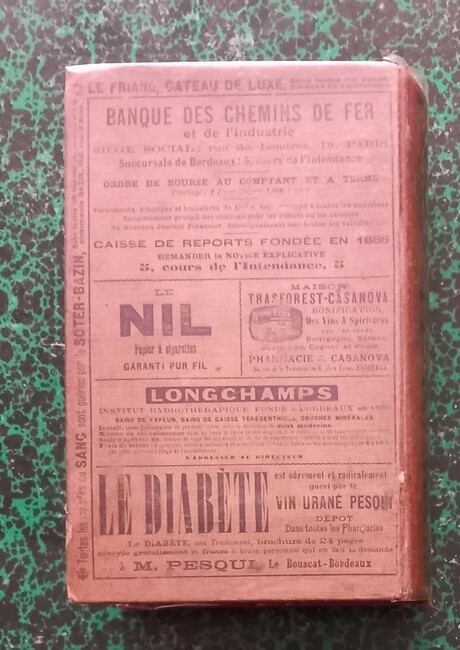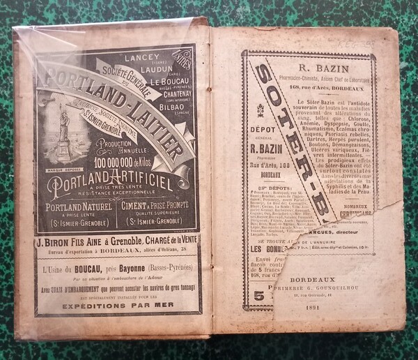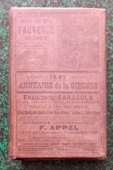 Imprimerie G. Gounouilhou 1891. Fort volume relié toile éditeur ( toile parsemée de petits manques épidermiques sur le premier plat et le dos, haut et bas du dos abîmés: voir photos, dos en partie recollé ), couverture illustrée d’enseignes publicitaires de commerces locaux, manque d’environ un tiers à la page de garde ( recto: publicité pleine page, verso: abréviations et signes + sommaire ), intérieur présentant de nombreuses jaunissures, 1573 pages. Peu fréquent.
