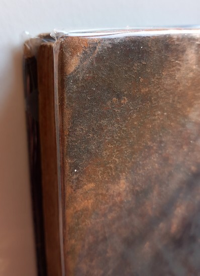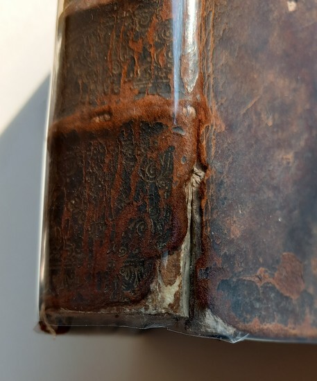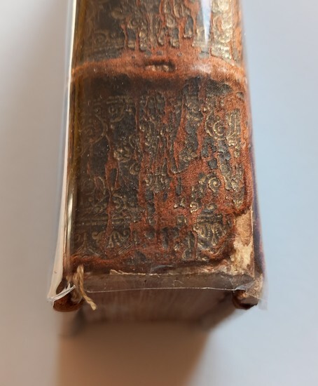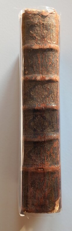Chez Thomas Guillain 1685. Reliure plein cuir, plats avec manques de peau en surface, coin supérieur du premier plat abîmé avec manque, haut du dos usagé, bas du dos abîmé et coiffe manquante, bas de charnière du premier plat fendu sur 3 cms. Dos 5 nerfs, caissons décorés, vignette de titre manquante. Légères mouillures des pages 341 à 374, erreurs de pagination ( sans manque de texte ): page 288 numérotée 284 et la numérotation passe de 329 à 340. Frontispice + page de titre + 36 pages d’epistre / préface + 363 pages ( la dernière étant numérotée 374 ).