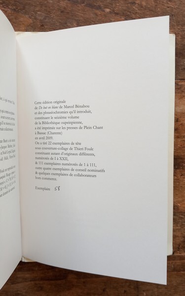 Un des 111 exemplaires numérotés, après les 22 exemplaires de tête sous couverture-collage de Thieri Foulc. Envoi autographe signé de l’auteur à Yves Frémion. Une petite éraflure sans manque au haut du 1er plat de couverture. Bon état intérieur.