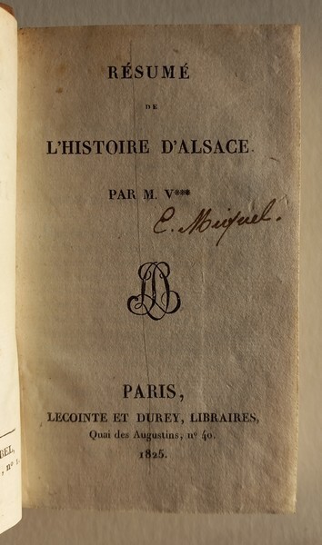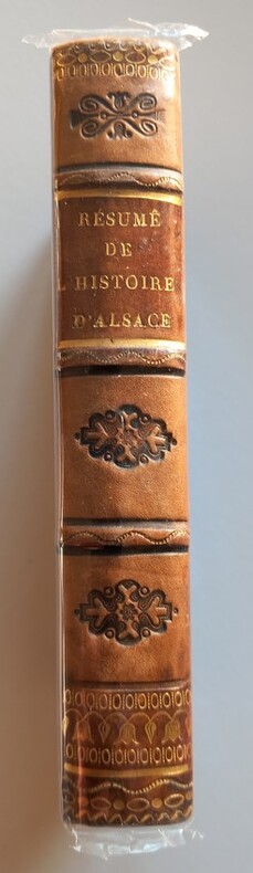 Vinaty, Résumé de l’histoire d’Alsace, Lecointe et Durey 1825, Paris, petit in-18 relié demi-basane à coins de l'époque, dos à 3 nerfs, fleurons à froid, titre doré sur le dos, tranches citron, 375 pages ( manque sur la page 1 sans affecter le texte ), relié avec " Défense des résumés historiques " par Félix Bodin, 27 pages. Bon exemplaire.