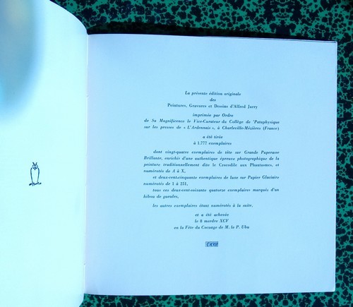 Paris Collège de 'Pataphysique 1968 1 vol. Broché in-8 carré, broché, couverture illustrée d'un dessin en couleurs, 125 pp. et 82 planches (dont un fac-similé dépliant), bibliographie. Premier tirage de cet album, soigneusement édité, qui rassemble toute l'oeuvre graphique de Jarry, depuis les dessins du lycée jusqu'aux peintures à l'huile des bords de Seine, en passant par les nombreux profils d'Ubu. Exemplaire provenant de la bibliothèque d'Alain Resnais.