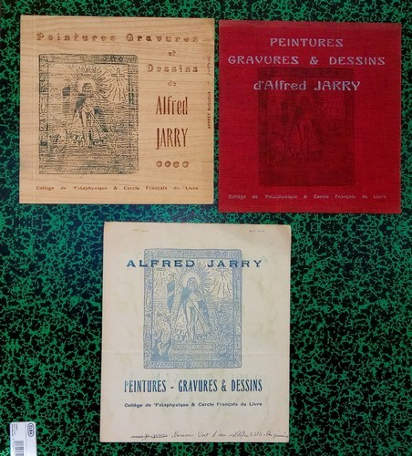 Alfred Jarry, Peintures gravures et dessins, Collège de Pataphysique, 25 mai 1968 ( 8 merdre XCV ), broché, petite éraflure sans gravité à la 4è de couverture, texte de Michel Arrivé, quelques photos en noir in et hors texte suivies des reproductions des oeuvres à pleines pages dont une en dépliant et, à la suite, une table commentée des oeuvres reproduites, exemplaire numéroté ( n° 117 ) sur Papier Glaciaire, 125 pages, bon exemplaire. Sont jointes 4 maquettes de couvertures ( 2 + une 3è imprimée recto verso ) avec annotations sur les couleurs.