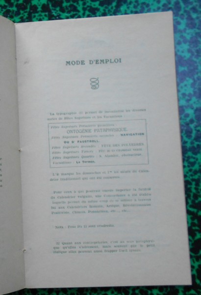 Calendrier perpétuel, Collège de Pataphysique 78 EP ( 1951 ), plaquette de 24 pages cousues ( pages non coupées ), sous couverture cartonnée grise. Bel exemplaire.