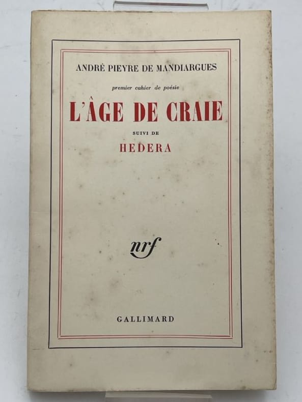 Edition originale sur papier courant pour "L'âge de craie". Envoi autographe signé d'André Pieyre de Mandiargues à Henri et Geneviève Parisot. Ouvrage illustré, en frontispice, d'un portrait photographique de l'auteur. Agréable exemplaire complet de son prière d'insérer. - Photographies et détails sur www.Edition-Originale.com -