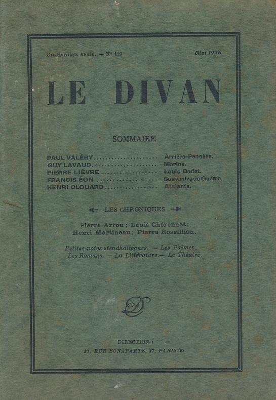 Le divan Le Divan, 1926. In-12 broché. Rousseurs. Paul Valéry : arrière-pensées. Pierre Lievre : Louis Codet, etc. Bon état