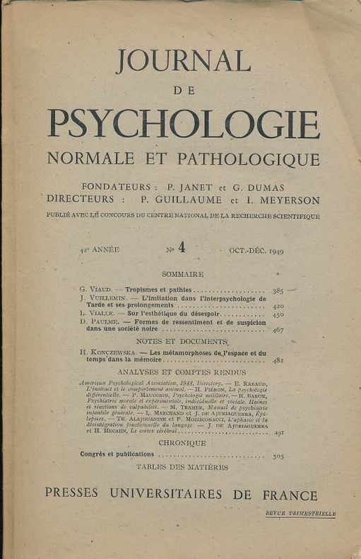 Puf Paris, Puf, 1949. In-8 broché. 42e année. N°4 d'octobre - décembre 1949. Manque sur le haut du dos, et quelques passages soulignés au crayon de papier sinon Bon état