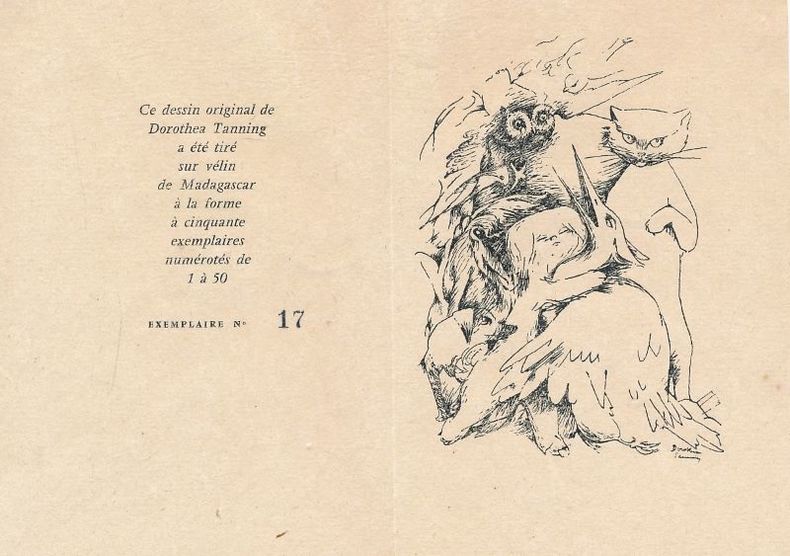 Fasquelle Paris, Fasquelle, 1957. In-12 broché de 93 pages. Collection Libelles. Edition originale. L'un des rares 50 exemplaires sur vélin alfa et portant le n°17, seul grand papier. Bien complet du dessin original de Dorothea Tanning, tiré à part sur vélin de Madagascar à 50 exemplaires seulement. Très bel exemplaire.