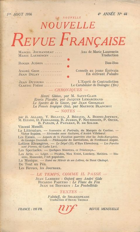 Paris, Nrf, 1956. 1er Paris, Nrf, 1956. 1er Août 1956. N°44. In-8 broché. Edition originale. Contributions de Marcel Jouhandeau, Marie Laurencin, Roger Judrin, etc. Quelques rousseurs en couverture sinon Bon état