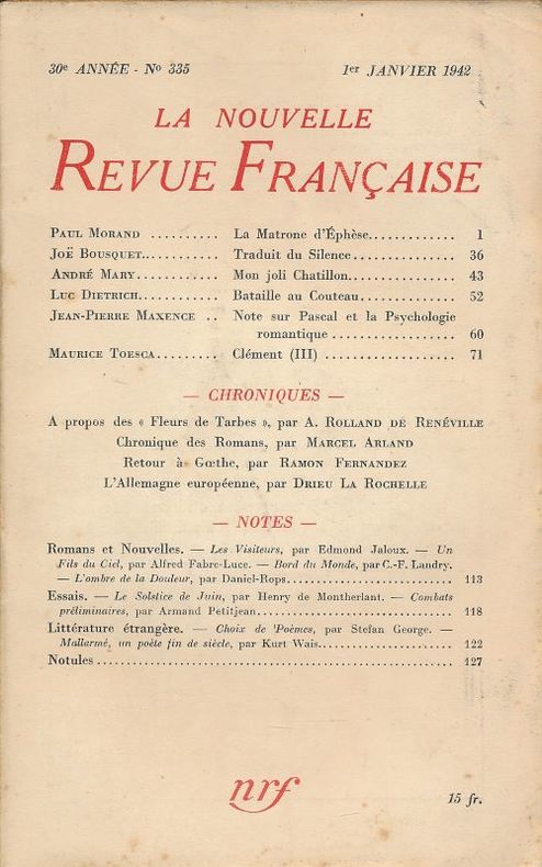 Paris, Nrf, 1942. 1er Paris, Nrf, 1942. 1er janvier 1942. N°335. In-8 broché. Edition originale. Contributions de Paul Morand, Joë Bousquet, Luc Dietrich, etc. Quelques rousseurs en couverture sinon Bon état