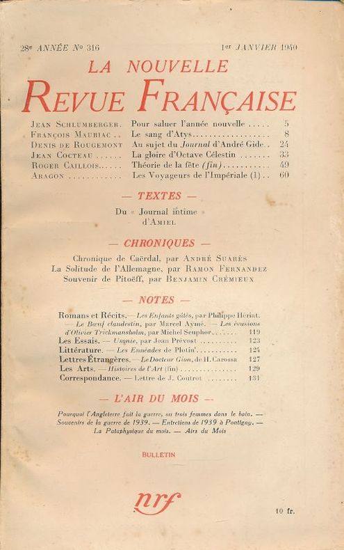 Paris, Nrf, 1940. 1er Paris, Nrf, 1940. 1er janvier 1940. N°316. In-8 broché. Edition originale. Contributions de Jean Schlumberger, Denis de Rougemont, Jean Cocteau, Roger Caillois, etc. Quelques rousseurs en couverture sinon Bon état