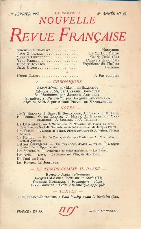 "1958. Paris Éditions La Nouvelle Revue Française revue mensuelle 6e année N° 62 - 1er Février 1958 - Edition originale exemplaire H. C. sur pur fil - Broché 14 cm x 23 cm 191 pages - Textes de Shichiro Fukazawa (Narayama) ; Jean Grosjean (La Mort du Maître) ; Martin Heidegger (Georg Trakl (fin)) ; Yves Régnier (L'Envers des Choses) ; Eugène Ionesco (Expérience du Théâtre) ; Jean Giono (Bestiaire) - Chroniques notes Le temps comme il passe Le mois Textes - Bien complet du bulletin de supplément à la nrf (8 pages) - Non coupé - Très bon état"