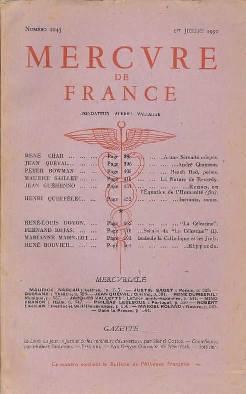 Mercure de France Paris, Mercure de France, 1950. 1er juillet 1950. N°1043. In-8 broché. Edition originale. Contributions de René Char, Jean Quéval, René Bouvier, etc. Quelques rousseurs en couverture sinon Bon état
