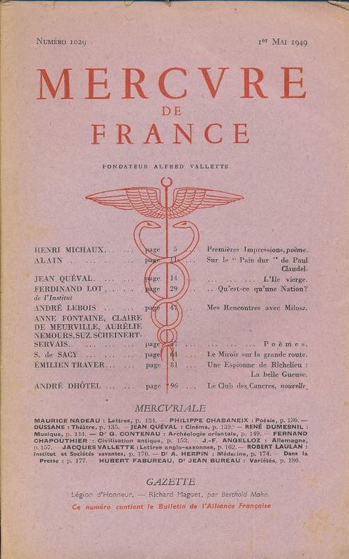 Mercure de France Paris, Mercure de France, 1949. 1er mai 1949. N°1029. In-8 broché. Edition originale. Contributions de Henri Michaux, Alain, Ferdinand Lot, André Dhotel, etc. Quelques rousseurs en couverture sinon Bon état