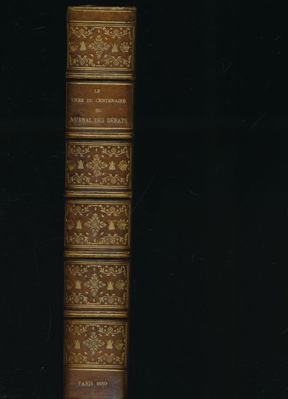 Paris Librairie Plon 1889 1 vol. relié in-4, plein veau havane, dos à nerfs soulignés de frises dorées, pièce de titre de maroquin rouge, caissons décorés de fleurons à froid et de filets dorés et à froid en alternance, frise dorée en pied, coiffes guillochées, plats encadrées d'une frise dorée et de trois filets gras dorés, coupes filetées, large dentelle intérieure dorée, tête dorée, couvertures et dos conservés, non rogné (Stroobants), XIV + 630 pp., 16 gravures hors-texte, dont 6 eaux-fortes, et 8 fac-similés hors-texte. Edition originale de ce recueil d'études sur l'évolution idéologique du "Journal des Débats", ses plumes les plus célèbres et ses diverses chroniques, avec une table générale de tous les collaborateurs depuis la Révolution. Très nombreuses contributions originales d'intellectuels du temps, parmi lesquels le duc d'Aumale, Ernest Bertin, Paul Bourget, Victor Cherbulliez, Paul Desjardins, Alexandre Dumas fils, Ludovic Halévy, Ernest Legouvé, Jules Lemaître, Ernest Renan, Léon Say, Jules Simon, H. Taine, etc. Exemplaire nominatif imprimé pour un abonné du Journal, dans une luxueuse reliure signée de l'époque, très bien conservée.