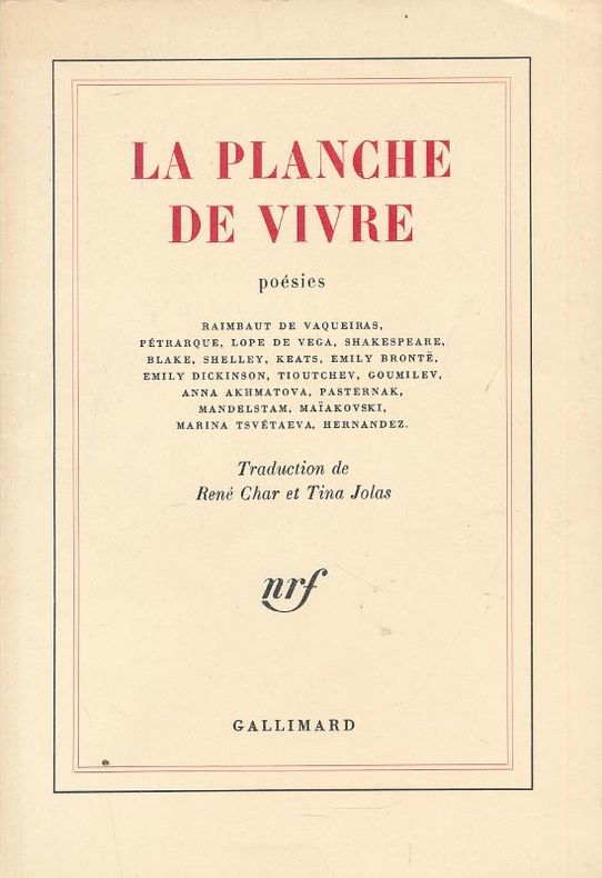 Paris Gallimard 1981 1 14 x 20,5 cm broché 155 pp Traduction de René Char et Tina Jolas.