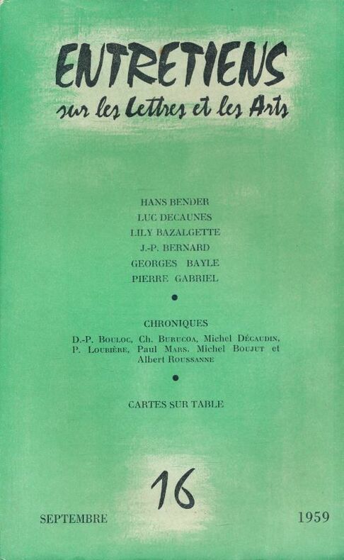 ENTRETIENS SUR LES LETTRES ET LES ARTS. N° 16. (Septembre 1959). Hans Bender, Luc Decaunes, Lily Bazalgette, Georges Bayle, Denys-Paul Bouloc, etc. // Très bon état.