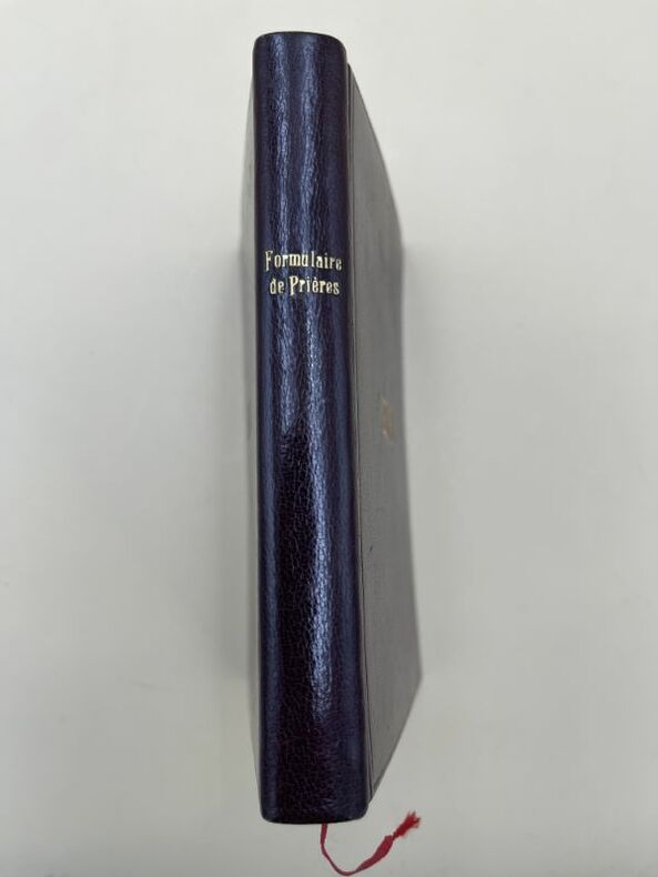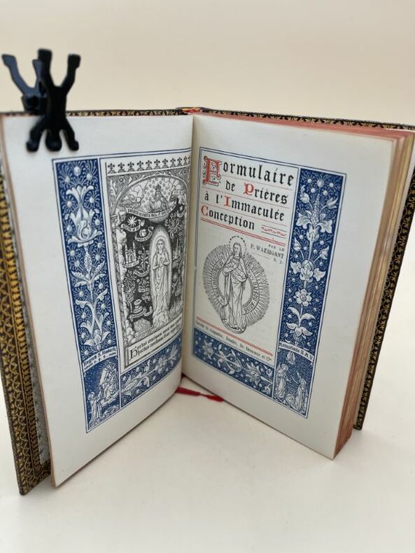 Desclée de Brouwer Desclée de Brouwer 1904, In-12 relié plein maroquin marron, dos lisse à titre doré, initiales dorées sur le splats M.B.,toutes tranches dorées, roulette dorée sur les coupes, large roulette dorée intérieure, gardes de papier glacé à semis d'étoiles, 255 pages, chaque page de texte dans un bel encadrement floral bleu, le tout dans un coffret cartonné. Très bel exemplaire en parfait état. Rare