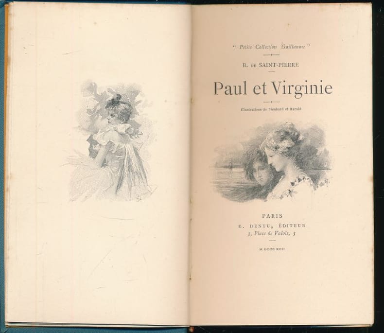 Exemplaire - agrémenté de jolis ornements typographiques - revêtu d'une agréable reliure du temps. Issus de deux familles différentes, Paul et Virginie sont élevés en commun comme frère et sœur, dans la splendeur naturelle des paysages tropicaux de lîle Maurice. Mais à l'adolescence, des sentiments amoureux naissent entre les deux personnages. La mère de Virginie, Madame de la Tour décide alors de l'éloigner de Paul en envoyant sa fille étudier en France, laissant Paul à son chagrin. Plusieurs années après, Virginie annonce son retour sur l'île, mais le navire qui la ramène de France est pris dans une tempête... Appartenant au registre pathétique, Paul et Virginie décrit avec force les sentiments amoureux et la nostalgie du paradis perdu. Au-delà du cadre exotique et de la description d'une société idyllique, Bernardin de Saint-Pierre expose dans ce roman sa vision pessimiste de l'existence. Angles et coupes légèrement élimés. Quelques claires rousseurs et petites tâches éparses dans le corps d'ouvrage. Du reste, très belle condition.
