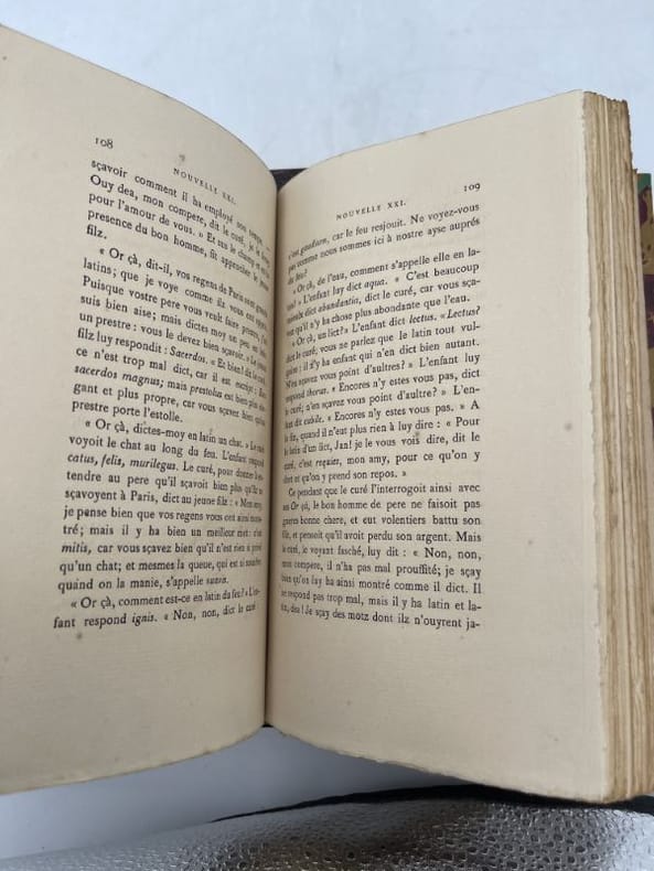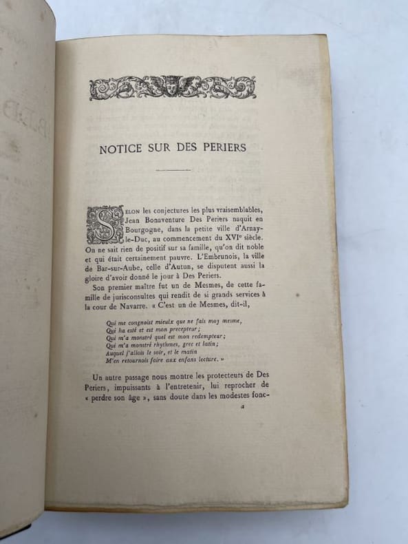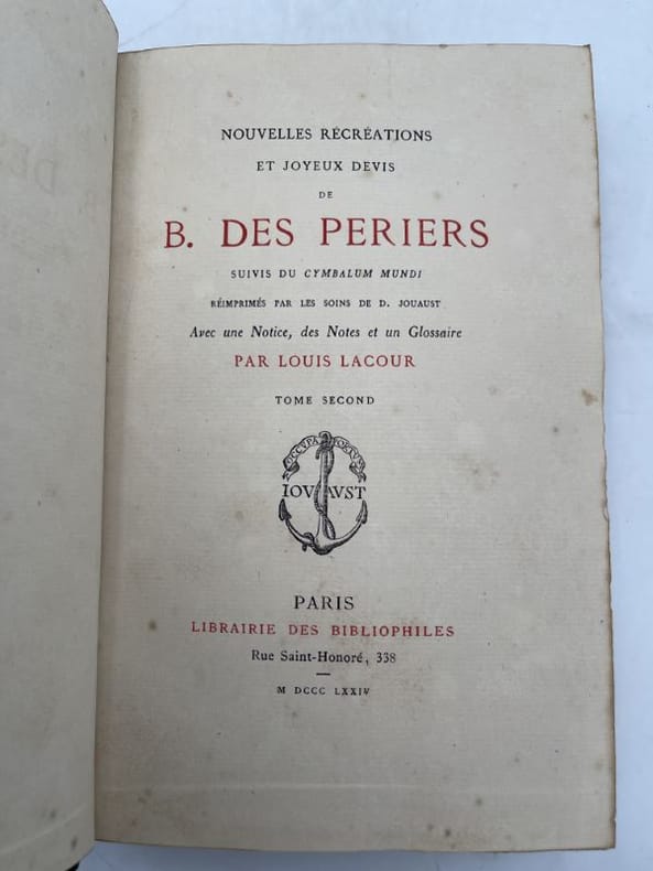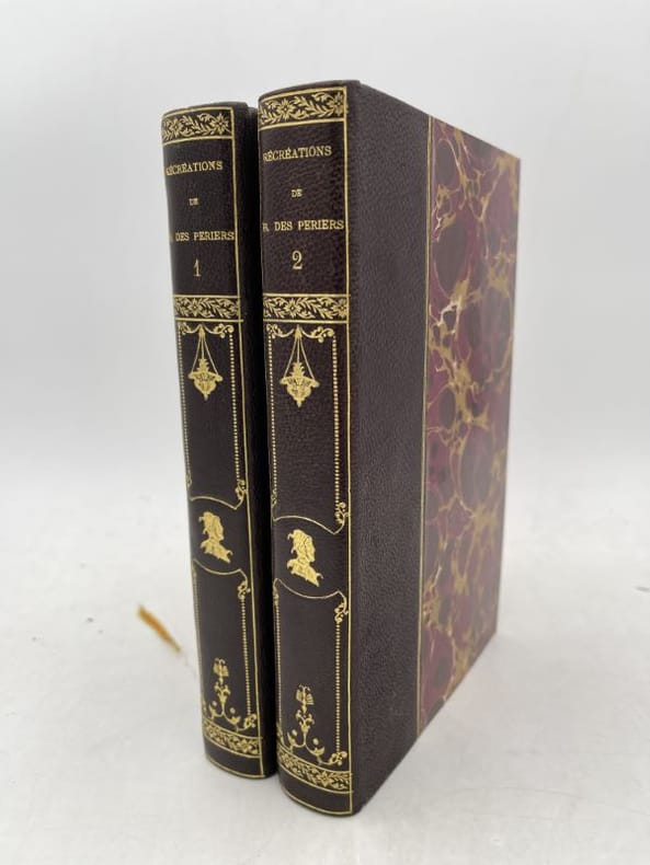 Jouaust, Librairie des Bibliophiles, 1874, 2 vol. in-8°, xlii-277 et 326 pp, imprimé sur papier vergé de Hollande, brochés, bon état. (Coll. les Conteurs français). Ce livre de Bonaventure des Périers fut qualifié d'hérétique, lors de sa sortie en 1537 et interdit en 1538. L'auteur, proche des milieux humanistes protestants nous livre une série de fables succulentes, mélanges de farces philosophiques.