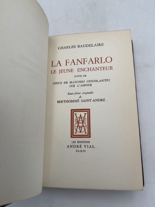 Editions André Vial Editions André Vial, 1947. In-8 relié demi chagrin bordeaux à coins, dos à nerfs et fleurons dorés, tête dorée, couverture conservée, gardes de papier marbré, reliure signée Franz. 145 pages. Illustré d'eaux fortes originales de Berthommé Saint André. Exemplaire numéroté sur vélin Lafuma frère filigrané. Infime frottement en dos. Bel exemplaire, bien relié