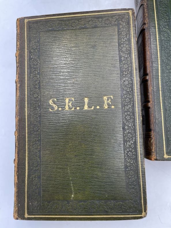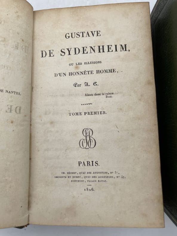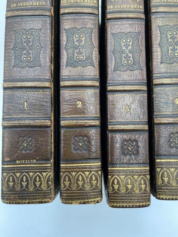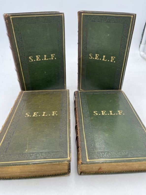 Ch. Béchet Paris Ch. Béchet, 1826. 4 volumes In-12 reliés plein maroquin vert foncé, dos à nerfs, filets, motifs dorés et fleurons estampés à froid, filets dorés d'encadrement sur les plats et guirlandes estampées à froid. Initiales dorées aux premiers plats : S.E.L.F. pour Suzanne Elisabeth Le Fourdrey. Toutes tranches dorées. Filets dorés sur les coupes, gardes de papier marbré. Reliures signées Bottier. Envoi autographe de l'auteur à Madame Le Fourdrey. 375 + 309 + 313 + 334 pages. Reliures légèrement frottées sans gravité. Importantes rousseurs. Achille Le Fourdrey, époux de Suzanne Elisabeth, était avocate et pasteur et est considéré comme celui qui a grandement contribué à la pénétration du protestantisme en Bretagne. Ces ouvrages ont appartenus à son épouse.