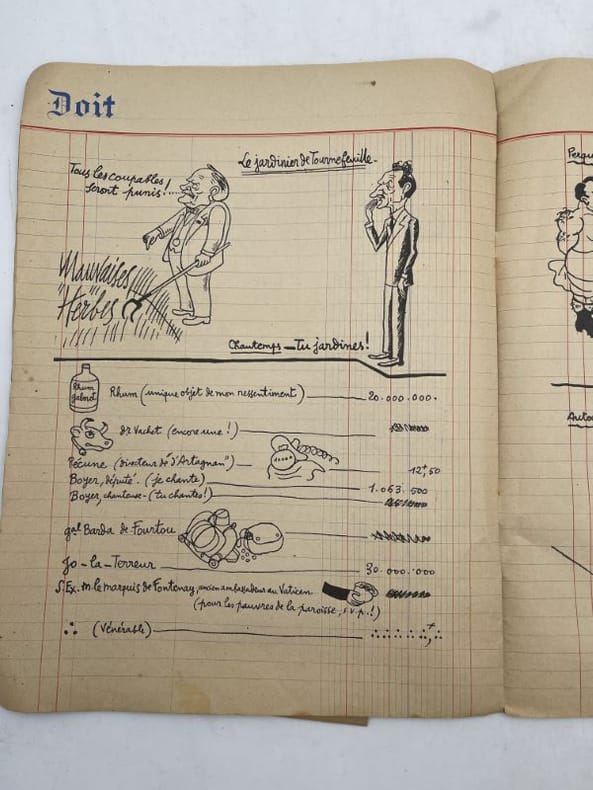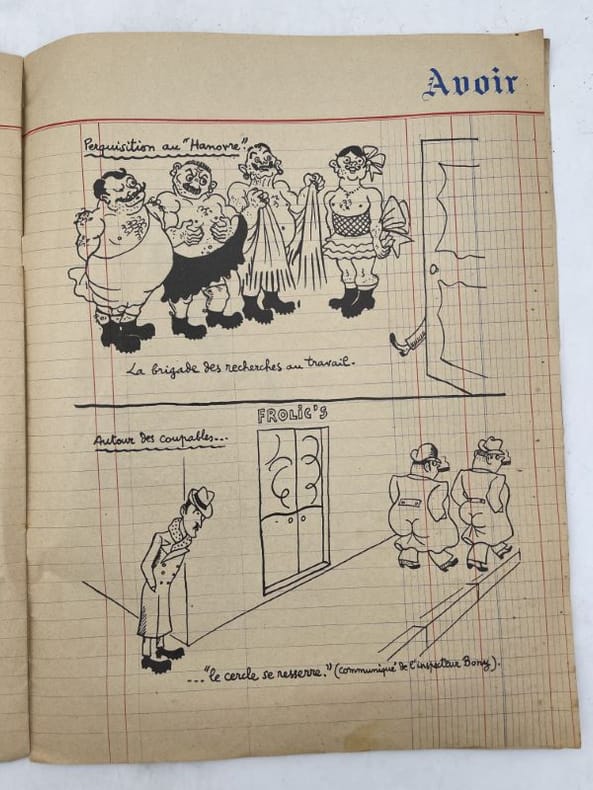 Couverture noire avec titre en rouge 20 pages,dessins en noir, et double page centrale en couleurs de SENNEP,se présente comme un livre de comptes sur papier à rayures verticales,avec DOIT sur la page de gauche et avoir sur la page de droite.Marge extérieure du premier plat de couverture légèrement ébarbées sur deux centimètres.