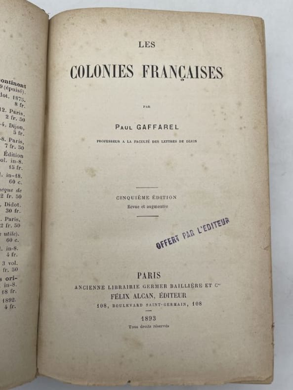 GEDALGE/9E EDITION. 1882. In-12. Relié. Etat d'usage, Couv. défraîchie, Dos satisfaisant, Quelques rousseurs. 508 pages - coins frottés - tampon sur la page de faux titre - RESUMES RECITS QUESTIONNAIRES CARTES ET GRAVURES SUIVI D'UN APERCU HISTORIQUE DES COLONIES FRANCAISE - tranches frottées - rousseurs sans réelle conséquence sur la lecture.. . . . Classification Dewey : 372.89-Livre scolaire : histoire / géographie