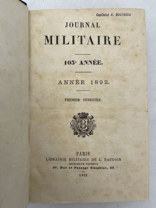 Librairie militaire de L Baudoin Librairie Militaire de L Baudoin, 1892. In-8 relié demi-basane bleue de 898 pages + XVI pages. Nombreux tableaux dont certains dépliants. Tampon d'appartenance en page de titre. Premier semestre 1892. Epidermures en reliure. Quelques rousseurs sinon Bon état.