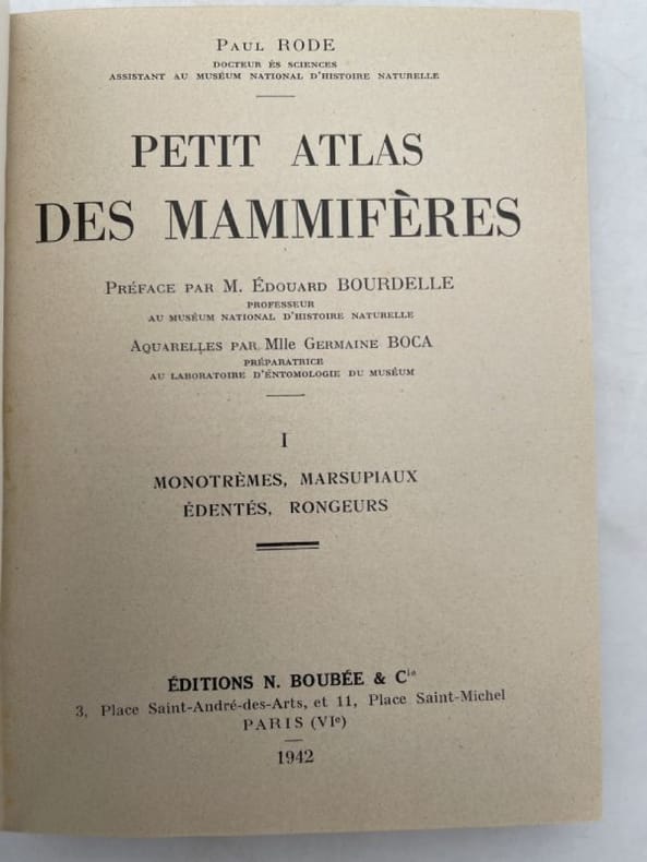 Boubée Paris, Boubée, 1942 - 1943. In-12 carré relié demie basane verte à coins. Dos à nerfs, titre doré en dos. Tome 1 : Monotrèmes, marsupiaux, édentés, rongeurs de 47 pages + 12 planches. Tome 2 : Ongulés de 61 pages + 12 planches. Tome 3 : Cétacés, sirénien, pinnipèdes, carnivores, chiroptères de 65 pages + 12 planches. Tome 4 : Insectivores, primates de 74 pages + 12 planches. Dos insolé sinon parfait état