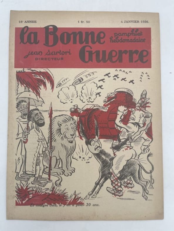 La Bonne Guerre Paris, La Bonne Guerre, 1935, N° du 4 janvier 1936. In-4 agrafé de 32 pages. Revue politique et économique satirique dirigée par jean Sartori. Sommaire : La bande Barmat - Stavisky. Ma B. G. en cour d'Assises. Lavages de parquet par le Procureur général Roux. Proust sera-t-il arrêté ? A l'Ecole Universelle. Simone Téry et l'U.R.S.S. La lutte deux capitalismes en Allemagne. Les fascistes en robes. Une heureuse initiative du sénateur Jean Odin. La vraie république. Le bilan de la faillite Laval. A travers les groupes et les ronds. L'émeute du 6 février. La destruction des denrées. Radio-Liberté. Les Turcs et nous. L'escroquerie d'Elisabethville. La B. G. en bourse. Laval et les agents de change. Le dernier "ours" de la Banque Française. De tout un peu. Illustrations hors texte en noir et blanc. Bon état.