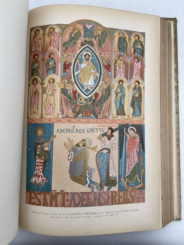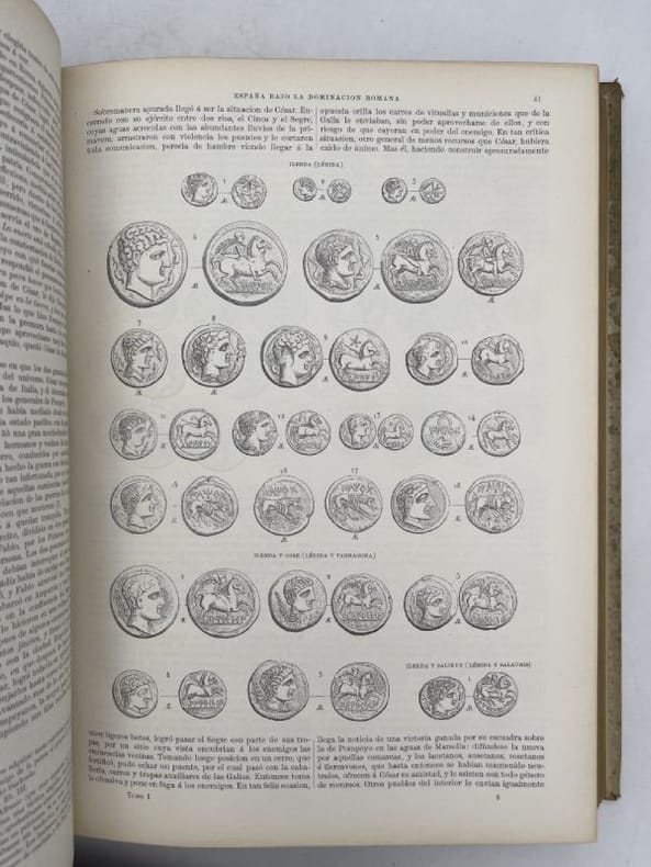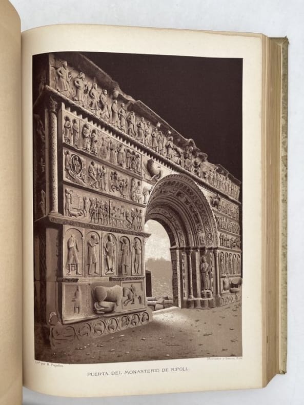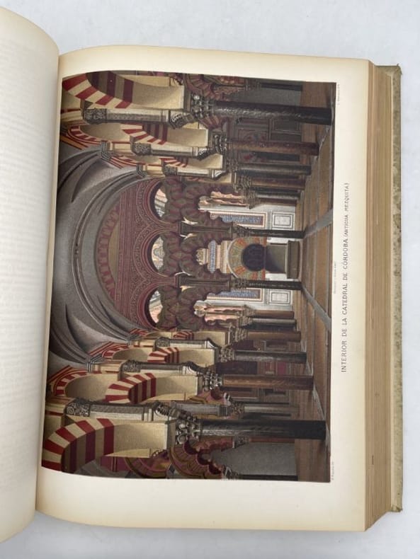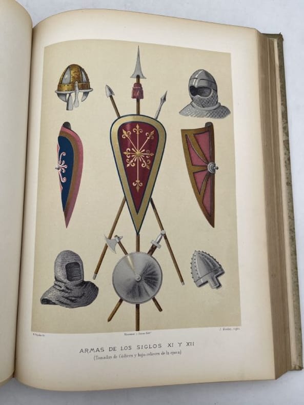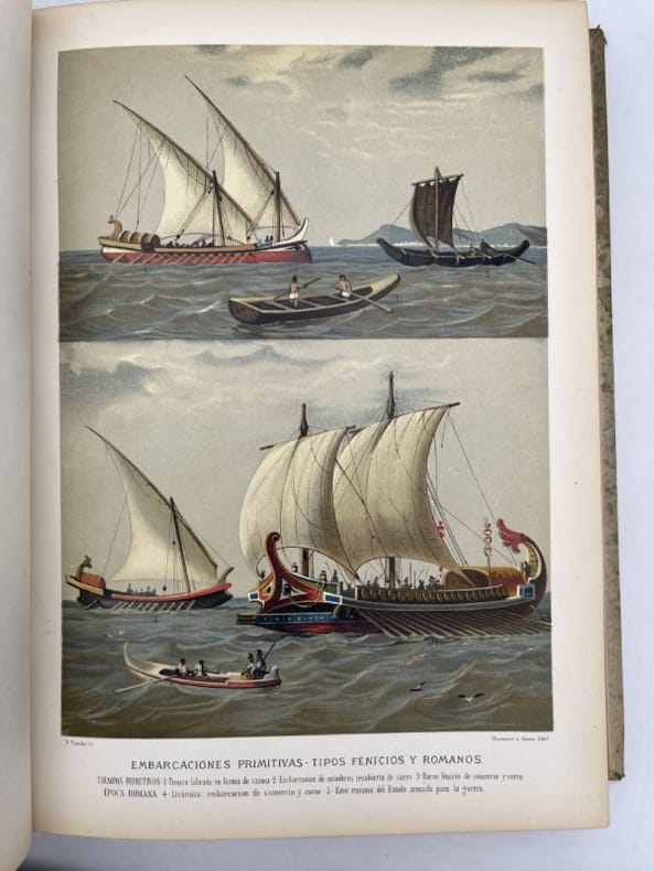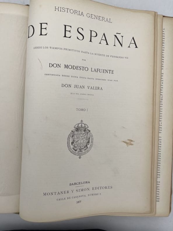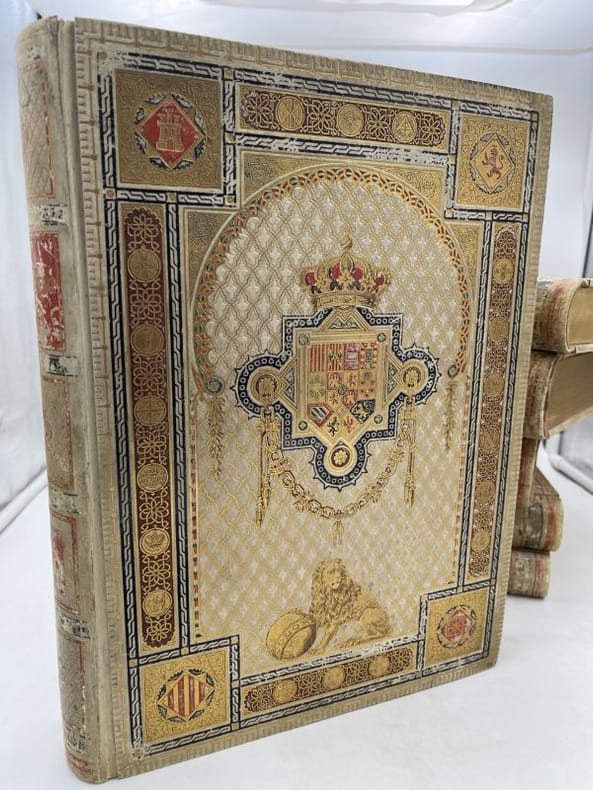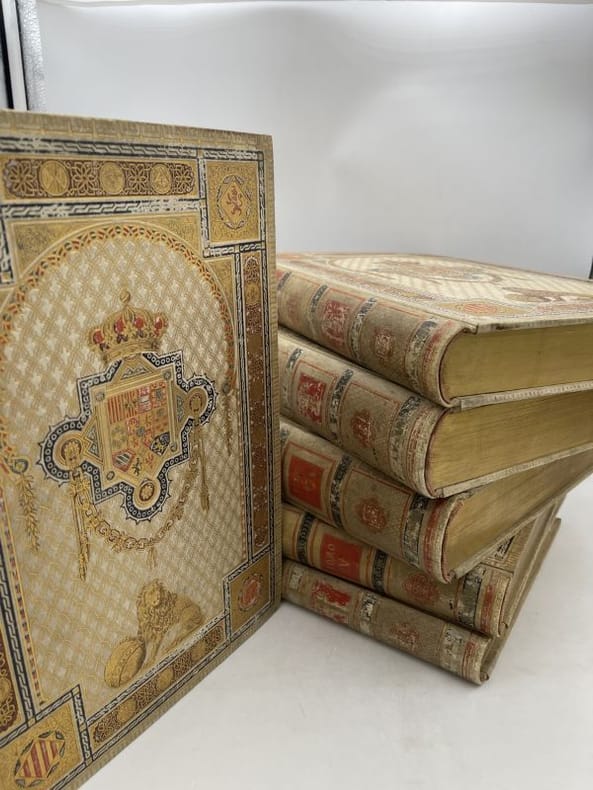 Montaner y Simon Barcelona, Montaner y Simon, 1877. 6 volumes In-Folio reliés plein carotnnage éditeur crème, doré et rouge aus plats et dos très décorés, tranches dorées. Continuada desde dicha época hasta nuestros días por D. Juan Valera. Très nombreusesfigures dans le texte, planches et chromolithographies sous serpentes. Complet en 6 volumes. Bel ensemble