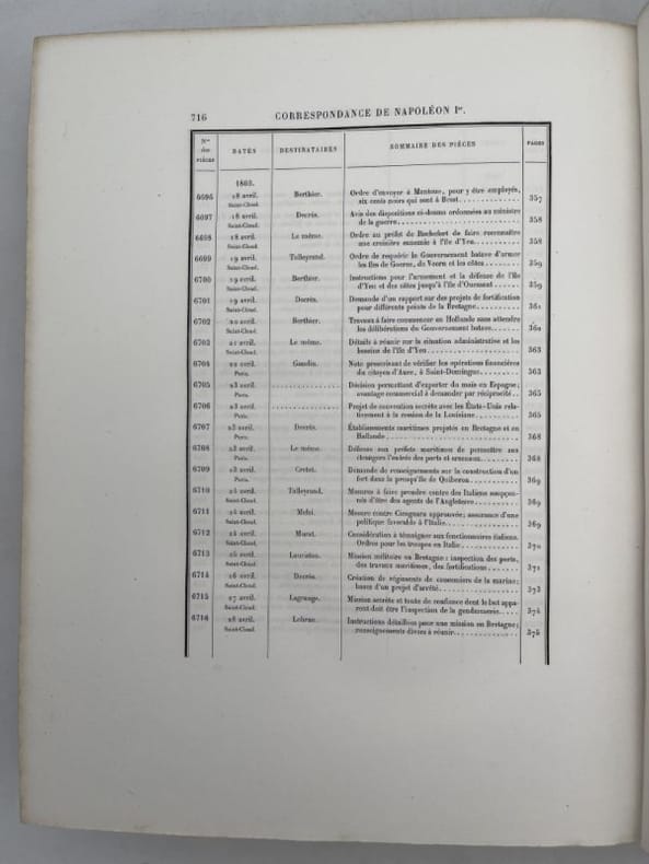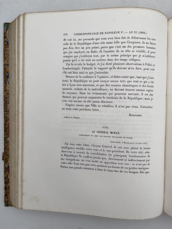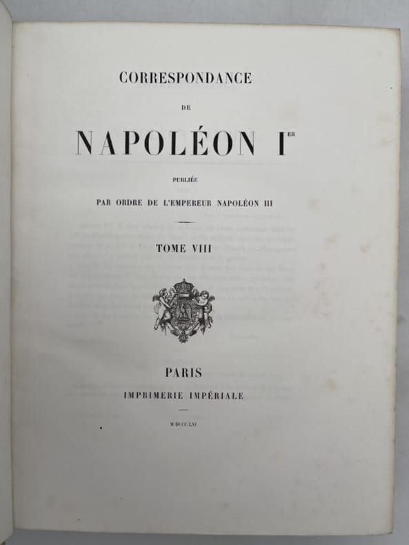 Imprimerie Impériale Paris, Imprimerie Impériale, 1861. Fort In-Folio relié demi-vélin blanc de 736 pages. Dos à liresés dorés, pièce de titre rouge et pièce de tomaison marron. Tome 8 seul. Regroupe 870 lettres, numérotées de 6259 à 7129, couvrant la période du 19 août 1802 au 23 septembre 1803 et traitant des affaires courantes du pays et de la diplomatie européenne. Tables reprenant la date et le lieu d'expédition ainsi que le destinataire de chaque lettre. Mors fendu et coupes frottées. Légères rousseurs sur la page de faux-titre et le dernier feuillet blanc. Bon état.