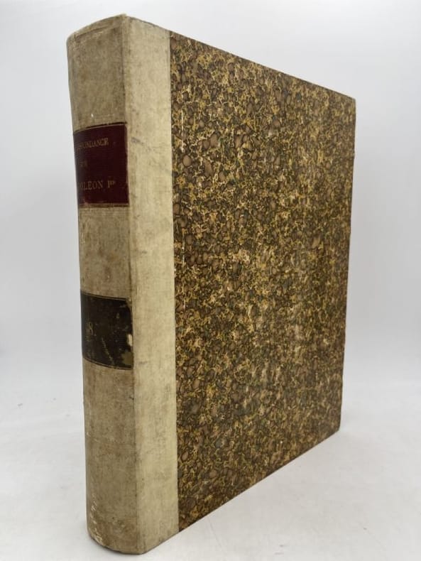 Imprimerie Impériale Paris, Imprimerie Impériale, 1867. Fort In-Folio relié demi-vélin blanc de 698 pages. Dos à liresés dorés, pièce de titre rouge et pièce de tomaison marron. Tome 22 seul. Regroupe 708 lettres, numérotées de 17535 à 18243, couvrant la période du 1er avril au 6 novembre 1811 et abordant essentiellemnt la conduite des opérations militaires en Europe, notamment en Allemagne. Tables analytiques et index des destinataires en fin d'ouvrage. Accroc sans manque en coiffe. Coins frottés. Légères rousseurs sur la page de faux-titre et le dernier feuillet blanc. Bon état.