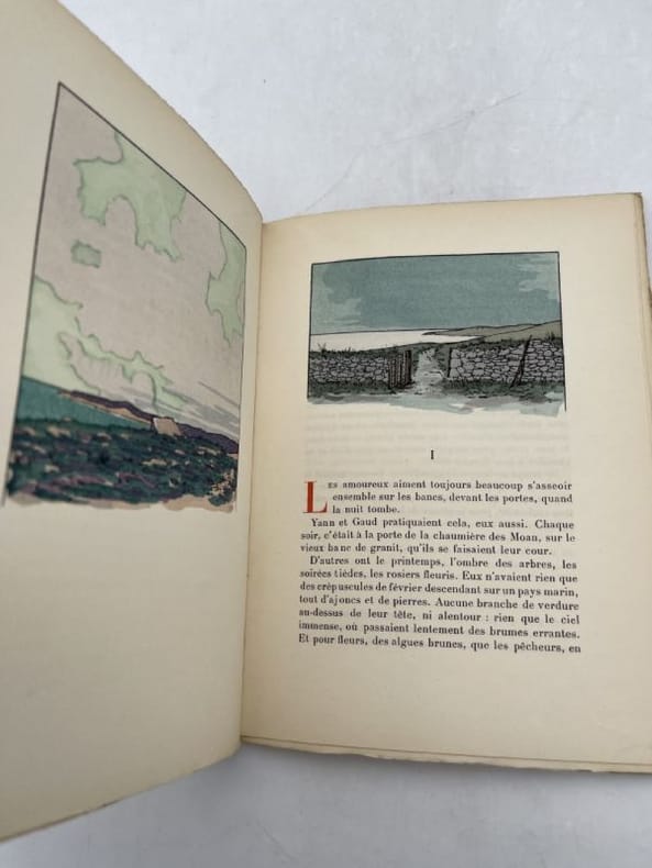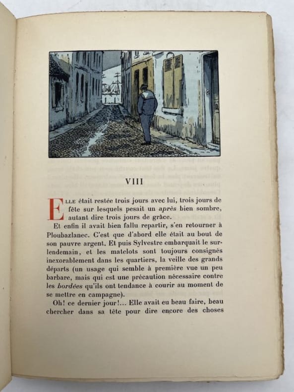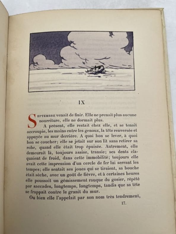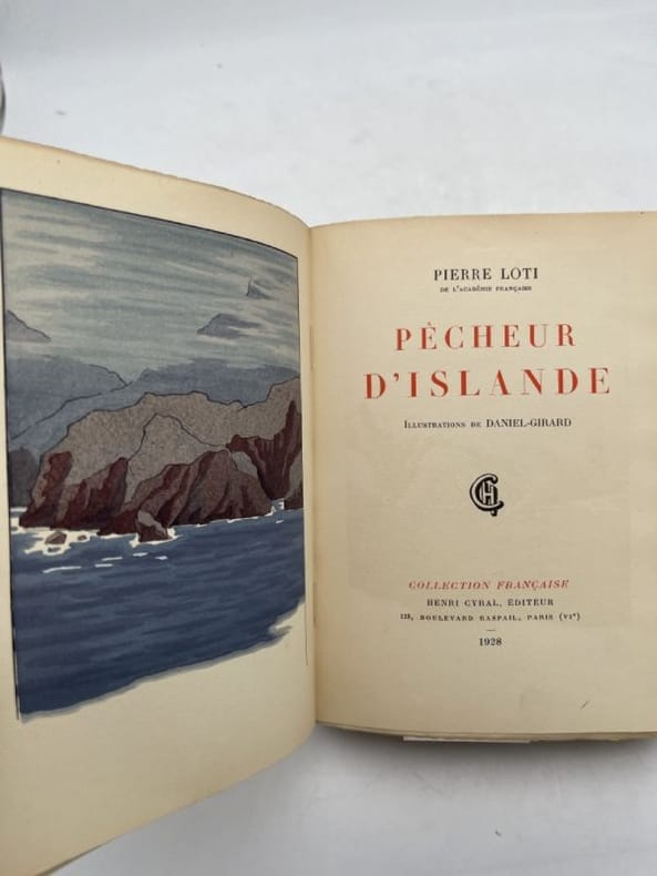 . Paris, Éditions Pierre Lafitte, 1923, 1 vol. in-4 (30 x 22,3 cm), 252 p. comme suit : 1 f. de faux-titre, 1 f. de frontispice couleur, 1 f. de titre, p 5 : avant-propos par Henri de Régnier, p 13 : notice biographique, p 19 : Madame Chrysanthème, p 127 : Pêcheur d'Islande, 1 f. de table des ouvrages. Deux romans complets illustrés, en noir et blanc in-texte et en couleur hors-texte, par Lucien Simon, A. Gorguet, A. Gumery, F. Lorioux et Lévy-Dhurmer. Deux récits ciselés prenant place au Japon (Madame Chrysanthème, 1887) et en Islande (Pêcheur d'Islande, 1886). Pierre Loti (1850-1923) : pseudonyme de Louis Marie Julien Viaud, romancier, officier de marine, français.