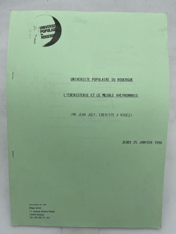 Université Populaire du Rouergue Université Populaire du Rouergue, 1990. Document tapuscrit In-4, agraffé. 4 pages de texte + 10 pages de dessins de meubles aveyronnais. Bon état