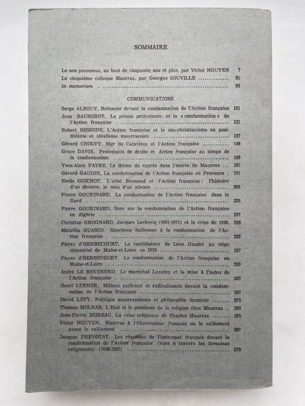Centre Charles Maurras Centre Charles Maurras, 1986. Fort In-8 broché de 395 pages + table. Première partie des actes du cinquième colloque Maurras: Non possumus. La crise religieuse de l'Action française. Présente les contribution de Serge Albouy, Gérard Gaudin, André le Reverend ou encore Pierre d'Herbecourt. Bon état.