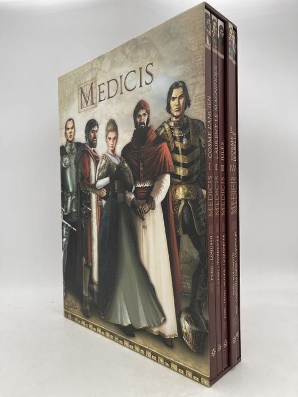 Soleil Soleil, 2017 - 2018. 5 volumes Grands In-4 reliés plein cartonnage éditeur sous étui. Tome 1 : Cosme l'ancien de la boue au marbre. Tome 2 Laurent le Magnifique. De père en fils; Tome 3 : Jules. De l'or à la croix. Tome 4 : Cosme 1er. Des miettes au festin. Tome 5 : Isabelle. Du baiser au poignard. Très bon état