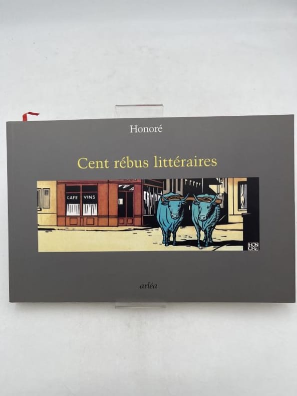 Les rébus littéraires sont tirés du magazine Lire, auquel Honoré collabora en proposant un rébus chaque mois. Ces rébus sont « littéraires », parce qu’ils concernent tous un écrivain, un titre d’oeuvre ou un héros de roman, du monde entier et de tous les temps. Tous sont conçus avec rigueur et ironie. Quant à la manière d’Honoré, si variée, qui va du pastel au collage en passant par le dessin ou la gouache, elle ajoute à l’excitation du jeu un vrai bonheur esthétique. Tous les rébus sont accompagnés de leur question-devinette, suivie, au verso, de la solution.Pas si facile que 4a, on a testé, mais tout à fait amusant et bien joli. Allez, on vous aide pour la dernière image: Haie-deux monts-rosse temps.