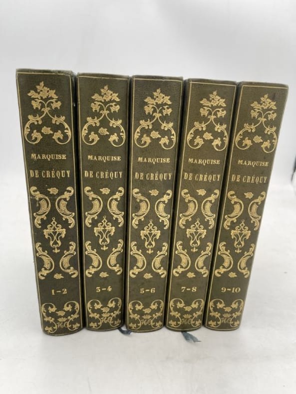 Paris, librairie Delloye, 1840. 10 tomes relies en 5 volumes, in-12*, reliure moderne en skyvaix blanc, pieces de titre rapportees en cuir bordeaux. Tomes 1, 248 pages. Portrait de Victoire de Froullay (Marquise de Créquy) en frontispice. Titre, Avis du libraire-éditeur, Avis de l'éditeur, A mon petit fils Tancrède Raoul de Créquy Prince de Montlaur, Nécrologie, Souvenirs, Table. Tome 2, 243 pages. Marie de la Vieufville (Marquise de Parabère) en frontispice. Souvenirs et table. Tome 3, 242 pages. Maréchal de Richelieu en frontispice. Souvenirs et table. Tome 4, 226 pages. Madame Necker en frontispice. Souvenirs et table. Tome 5, 252 pages. Louis Marie de Bourbon (Duc de Penthièvre) en frontispice. Souvenirs et table. Tome 6, 264 pages. Louis Marquis de Faucourt en frontispice. Souvenirs, Avis de l'éditeur et table. Tome 7, 240 pages. Marie Antoinette Reine de France en frontispice. Souvenirs et table. Tome 8, 243 pages. Marie Joséphine Louise de Savoie (Comtesse de Provence). Souvenirs et table. Tome 9, 248 pages. M.A.Charlotte Corday d'Armont en frontispice. Souvenirs, Pièces justificatives et table. Tome 10 et dernier, 239 pages. Planche héraldique en frontispice. Etat général de la noblesse de France avant la Révolution de 1789, Pièces justificatives, Anciens autographes inédits, Historiques ou Nobiliaires. Cet ensemble est malheureusement parseme de rousseurs, comme souvent.