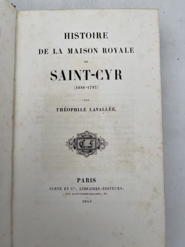 Furne Paris, Furne et Cie, 1853. In-4 relié demi-basane blonde glacée, dos à nerfs, pièce de titre rouge et verte. Gravure en frontispice Madame de Maintenon, XIV + 364 pages. Complet du plan sur double page de la Maison Royale, une gravure vue d'ensemble et 3 grands fac-similés dépliants. Cachet de bibliothèque Lambert de Beaujeu. Très bon exemplaire