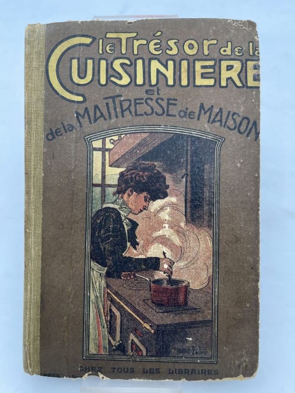 contenant par classification et par ordre alphabétique le calendrier culinaire- le moyen de faire bonne chère au meilleur marché possible- un traité des vins et des soins de la cave etc. suivi de Dictionnaire complet de cuisine, de pâtisserie et d’office In 12 cartonnage de l’éditeur dos toile, premier plat illustré en couleurs, titre, 240 pages, Paris Librairie Garnier éditeur sans date. Bon exemplaire.