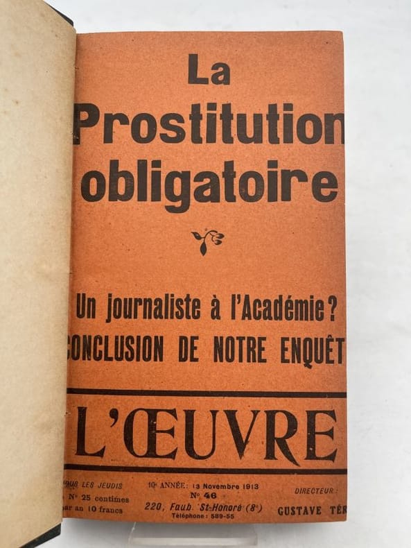 Au bureau Paris, L'oeuvre, 1913. 15 numéros de 1913 - 1914. In-8 étroit relié demi-toile bleue. Les couvertures sont conservées. La prostitution obligatoire : n°46 du 13 novembre. Querelles socialistes. Les mystères du tribunal de commerce Les panamistes de l'Ouenza. Les noms !; n°47 du 20 novembre. Le président de la République a t'il le droit d'être populaire : n°48 du 27 novembre. Doumergue alors... Le ministère contre l'Elysée. Le parlement contre la nation : N°50 du 11 décembre. Le nouveau parti. Le tango. Les fils à papa ou les privilèges de la démocratie... N° 1 du 1er janvier 1914. Petit traité de la civilité puérile à l'usage de quelques grandes personnes. N°2 du 8 janvier. Caillaux ! Caillaux ! n°3 du 15 janvier. Ca ne peux pas durer, c'est entendu, mais... Après ? : n0 10 du 5 mars. Histoire d'un crime ou nous ont menés les radicaillaux-socialistes. La forfaiture est établie : n°13 du 26 mars. Des mamers à Souillac. N° 17 du 233 avril. Mamers contre la France; N°18 du 30 avril. Peut-elle être acquittée ? : n°19 du 7 mai. Un jury blanc. Mme Caillaux jugée par les Femmes. N° 20 du 14 mai. La chambre mort née. N°21 du 21 mai. L'Affaire Cadiou. N°22 du 28 mai. Coupé court en bord.
