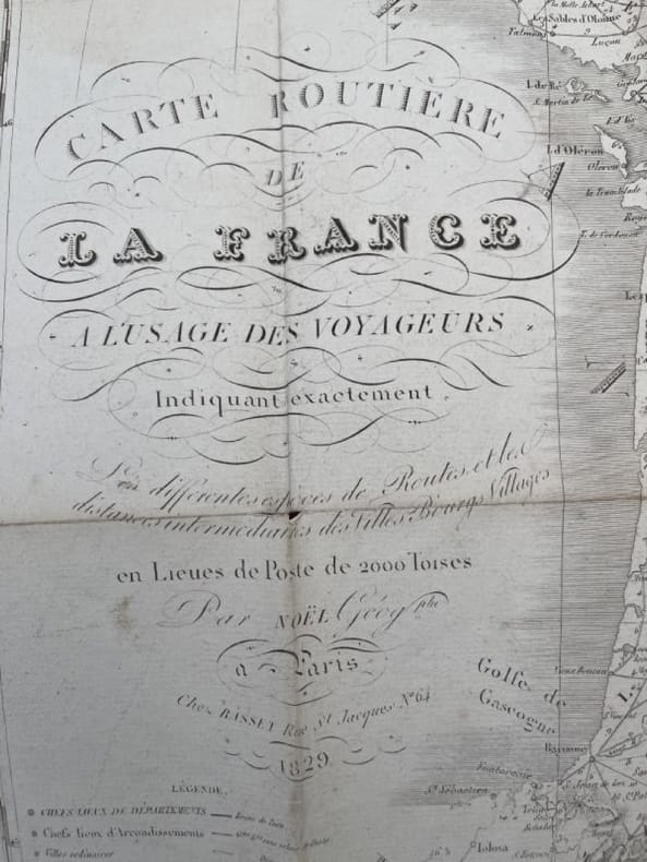 BassetM. Paris ,Chez Basset, 1829. Grande carte dépliante de 92*63 cm, repliée sous cartonnage. Carte en noir avec en bord, des suppléments pour : Madrid et Lisbonne. Turin, Florence, Milan, Rome et Naples. Vienne et Constantinople. Dresde, Berlin, Varsovie, Moscou et Saint Petersbourg. Copenhague et Stockholm. Amsterdam. Indiquant exactement les différentes espèces de routes et les distances intermédiaires des villes, bourgs, villages en lieues de poste de 2000 toises. Quelques déchirures aux pliures.