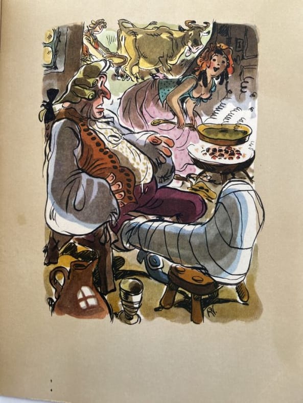 S.l., s.n. (Impr. Robert Condom), 1939. In-4 agrafé, n.p., 5 compositions comiques en couleurs à pleine page et texte en regard, d'après des extrait d'un manuel du 17e siècle.