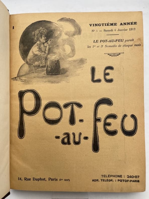 Le Pot au feu Paris, Le Pot-Au-Feu, 1912. In-4 reliure de toile noire, pièce de titre rouge contenant les 24 numéros de l'année 1912. Taches en reliure sinon exemplaire frais