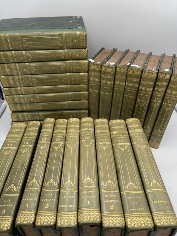 Paris, Pourrat frères, éditeurs Paris, Pourrat frères, éditeurs, 1833 - 1836. rue des Petits-Augustins, n°5 ; Furne, libraire éditeur, quai des Augustins, n° 39. 26 volumes In-8 reliés plein veau glacé vert. Dos lisses à longs motifs dorés, titre et tomaison doré. Tranches marbrées. Portrait de Chateaubriand, gravé par Hopwood et 24 gravures d'après les dessins d'Alfred et Tony Johannot, Raffet, David. Exemplaire sans la carte de l'itinéraire qui se vendait séparément. 1 et 2 : Essai historique sur les Révolutions. 3 : Mélanges historiques. 4, 5 et 6 : Etudes historiques. 7 : Voyages. 8 et 9 : Itinéraires de Paris à Jérusalem. 10 : Atala. René. Le dernier Abencérage. Poésies. 11, 12 et 13 : Génie du Christianisme. 14 et 15 : Les martyrs. 16 et 17 : Les Natchez. 18 : Mélanges littéraires. 19 et 20 : Mélanges politiques. 21 : Opinions et discours. 22 : Polémiques. Ce premier ensemble est bien complet en 22 volumes. En suivant et dans la même reliure : Le paradis perdu de Milton - Traduction nouvelle par M. de Chateaubriand : Paris, Furne et Charles Gosselin 1836 - 2 volumes. Enfin : Essai sur la littérature anglaise et considérations sur le génie des Hommes, des temps et des révolutions : Paris, Furne et Charles Gosselin 1836. Soit un semble de 26 volumes. Quelques rousseurs éparses, sans gravité. Ensemble bien relié.